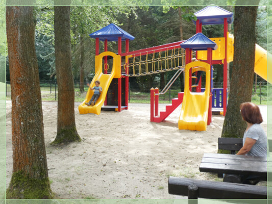 Unter schattigen Bäumen lädt unser Spielplatz zum Spielen und Klettern ein. Dort kann man auch das Modell der Harigburg bestaunen.
